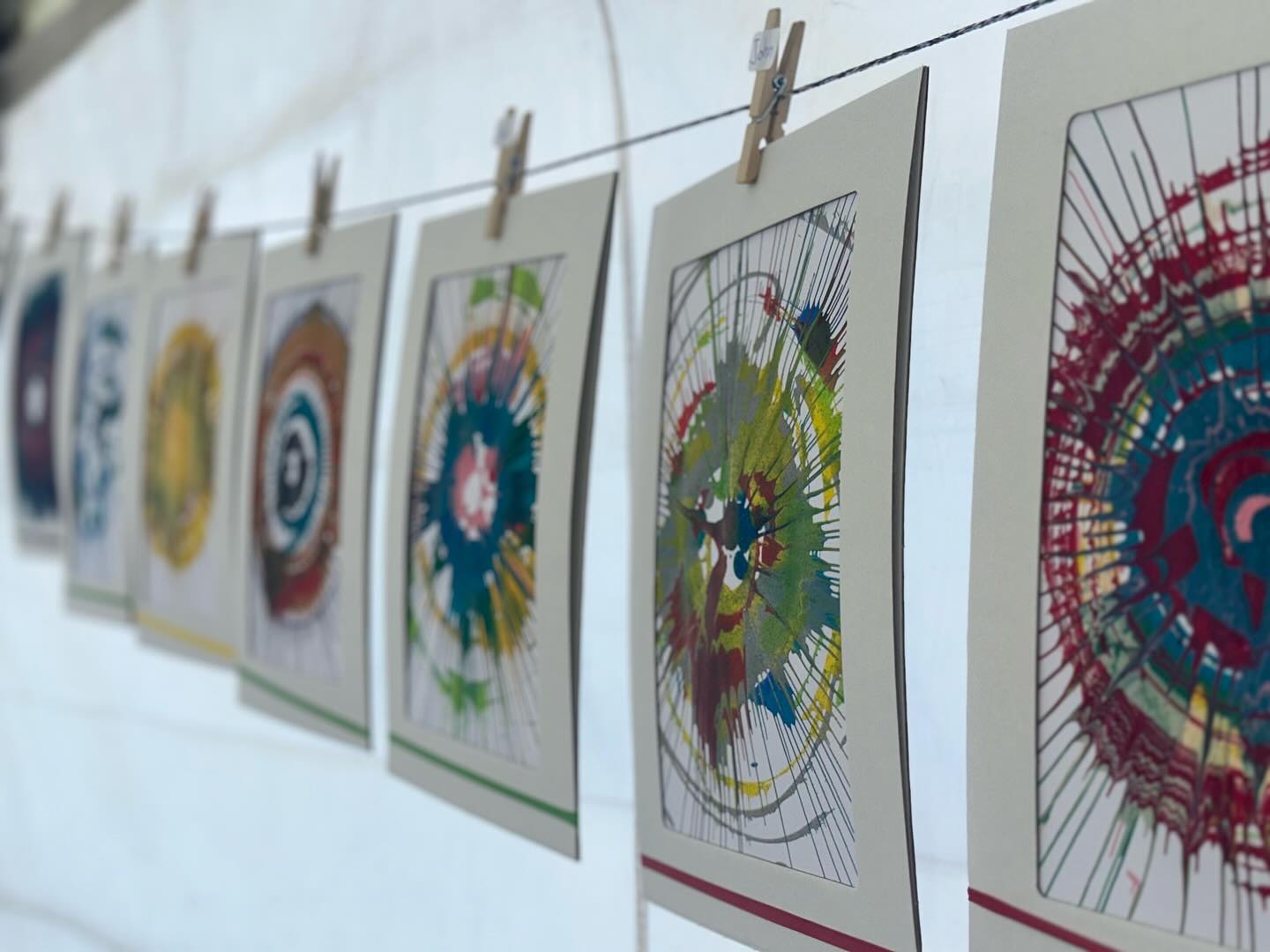 Ein sich schnell drehendes Blatt Papier wird mit verschiedenen Farben bespritzt.